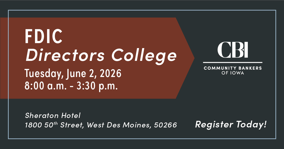 With over 50 years of experience supporting Iowa’s community banks, CBI stands out as the trusted association that empowers community banks to reach their potential. From advocating on critical legislative issues to offering hands-on support through training and industry insights, we’re here to make sure every community bank in Iowa has the resources to thrive. Together, we’re helping banks and the communities they serve flourish.